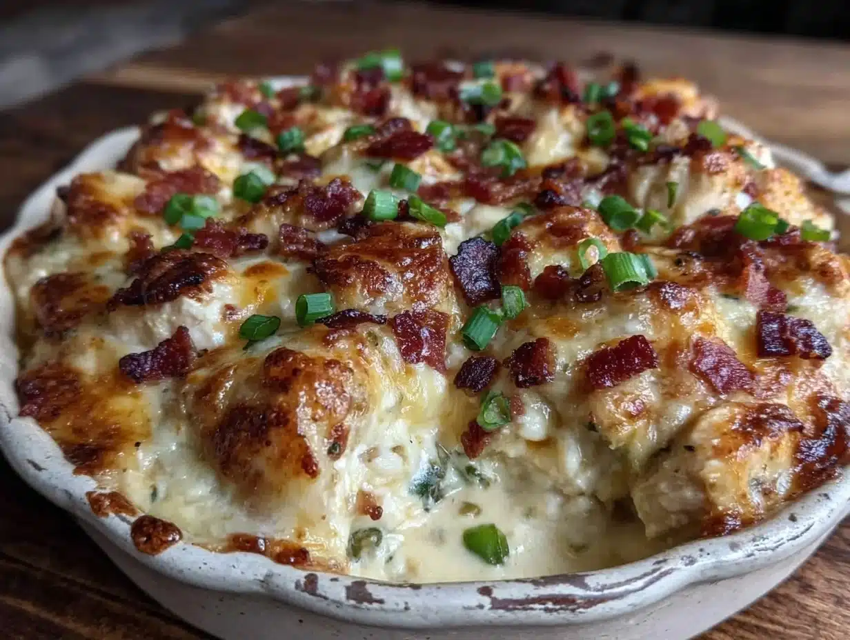 A rich, cheesy, and crispy keto-friendly chicken casserole featuring tender chicken, creamy cheese sauce, and crispy bacon. Perfect for quick weeknight dinners or meal prep.