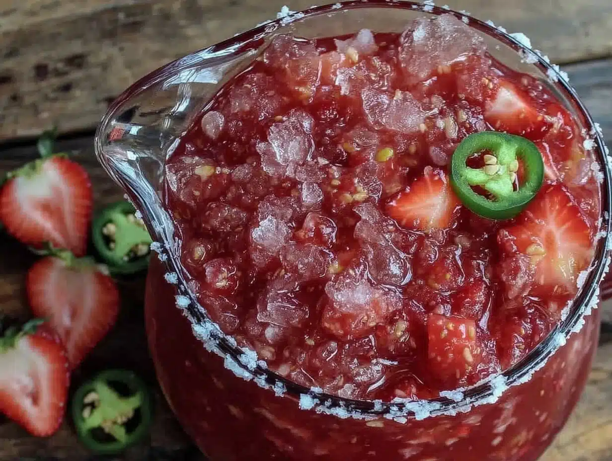A refreshing frozen margarita blending sweet strawberries with a mild jalapeño kick, perfect for summer gatherings and easy party batches.