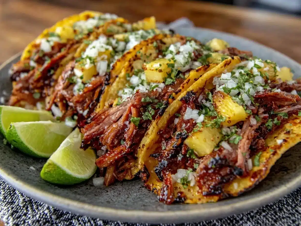 - Assemble tacos: pile pork onto warm tortillas, top with charred pineapple, diced onion, cilantro, and a squeeze of lime. Add salsa or pickled onions if desired.